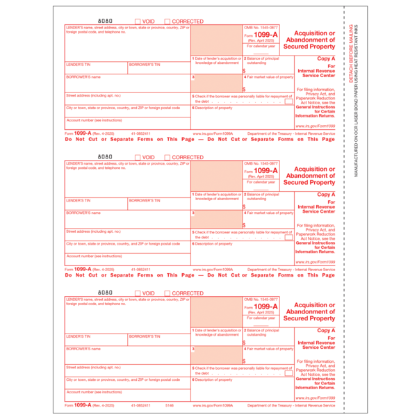 5146 1099-A Federal Copy A - 50 Pack SKU: 5146 $19.72 Prior Job# Special Instructions Logo & Options : $0 - Color Logo $68 - Black Logo $90 - Color Logo No Charge - 1 Color Logo No Charge - Black Logo Quantity -+ Please select options before adding to cart Add to Cart Add to Cart